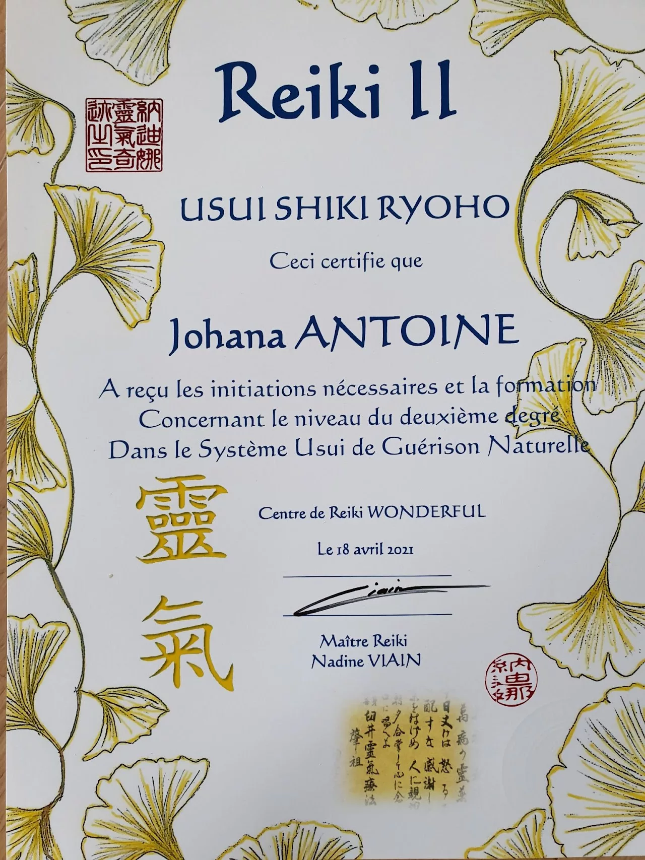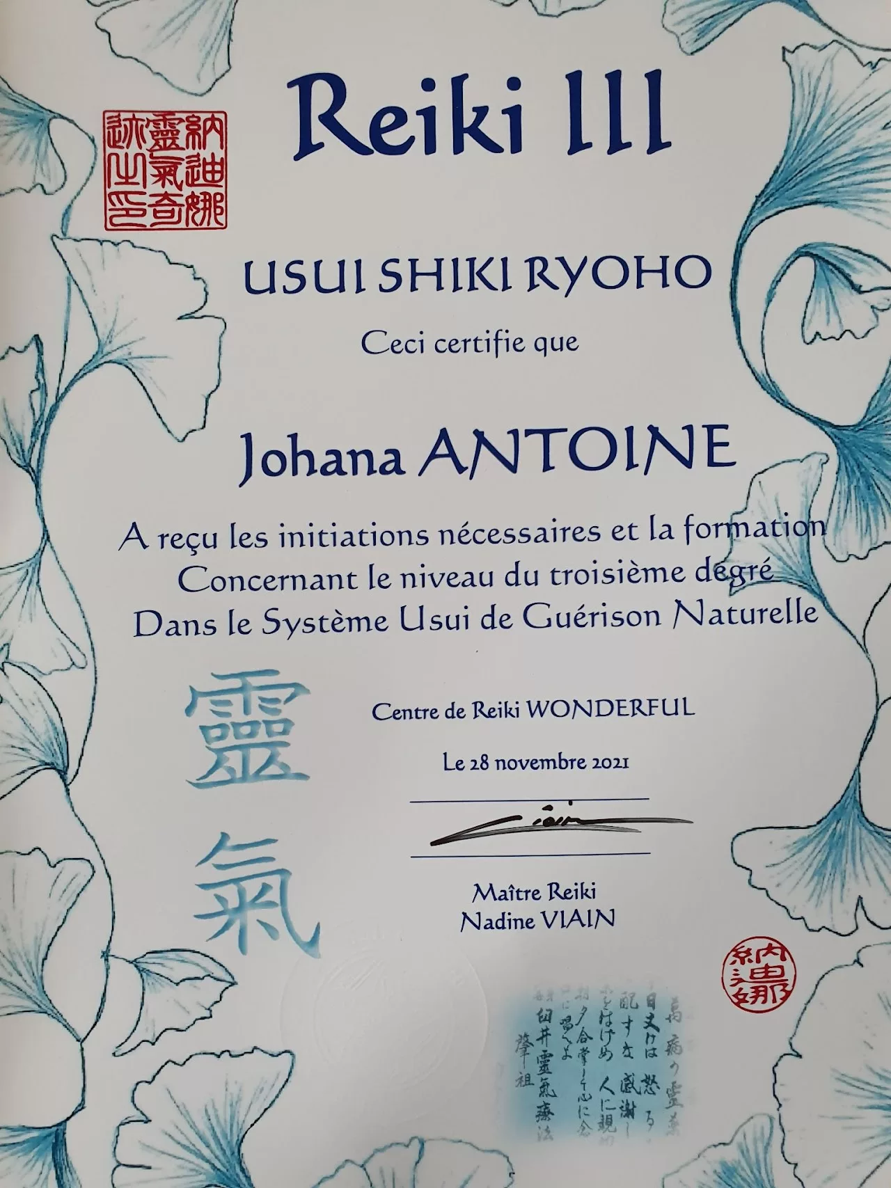 J’ai suivi les 3 degrés au centre de Reiki Wonderful auprès de Nadine Viain, Maître Reiki Usui et Reiki Karuna.